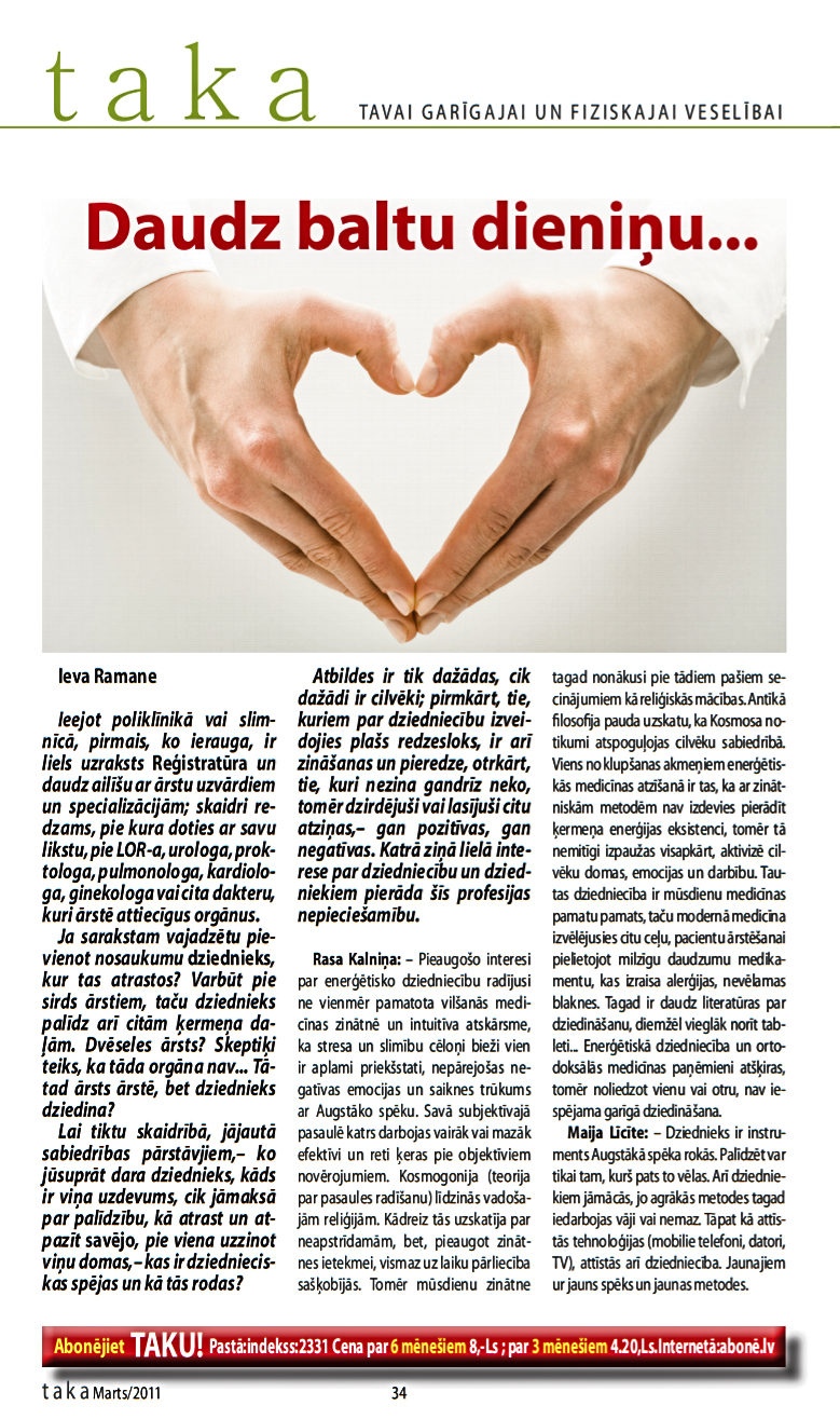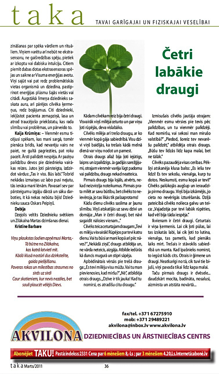 Dziedniecības centrs AKVILONA ir laidis klajā Dziedniecisko LAIMES kalendāru 2021.gadam ar 27 Latvijā pazīstamu speciālistu padomiem, kā atjaunot, stiprināt, vairot Gara, Dvēseles un Miesas Veselību, un kā kļūt laimīgiem. Saturiski bagāts sienas Kalendārs – lieliska dāvana visos gada svētkos! Lasiet, baudiet, priecājieties!