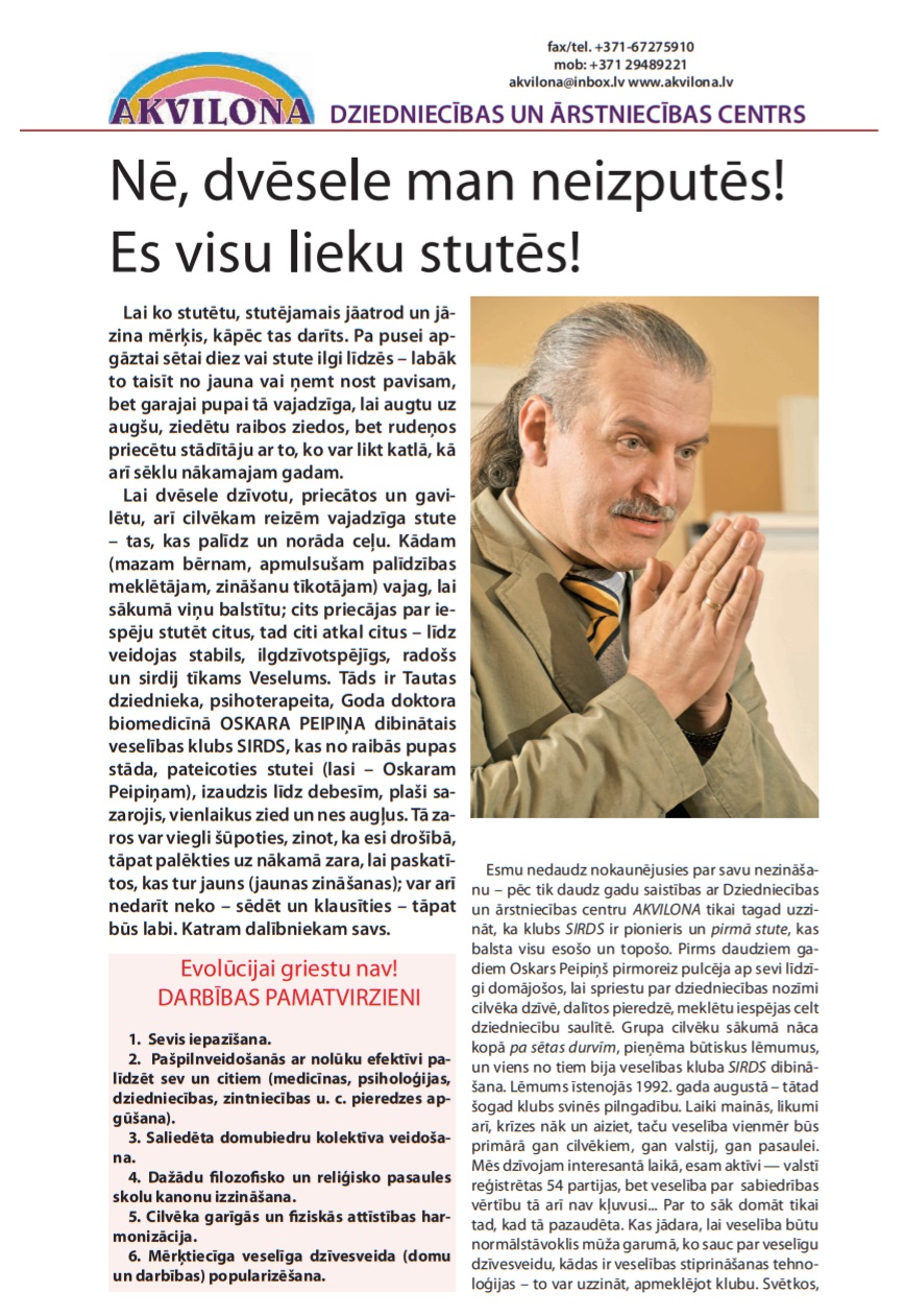 Veselības kluba “SIRDS” vadītājs, dziednieks, psihologs, Goda doktors biomedicīnā Oskars PEIPIŅŠ.