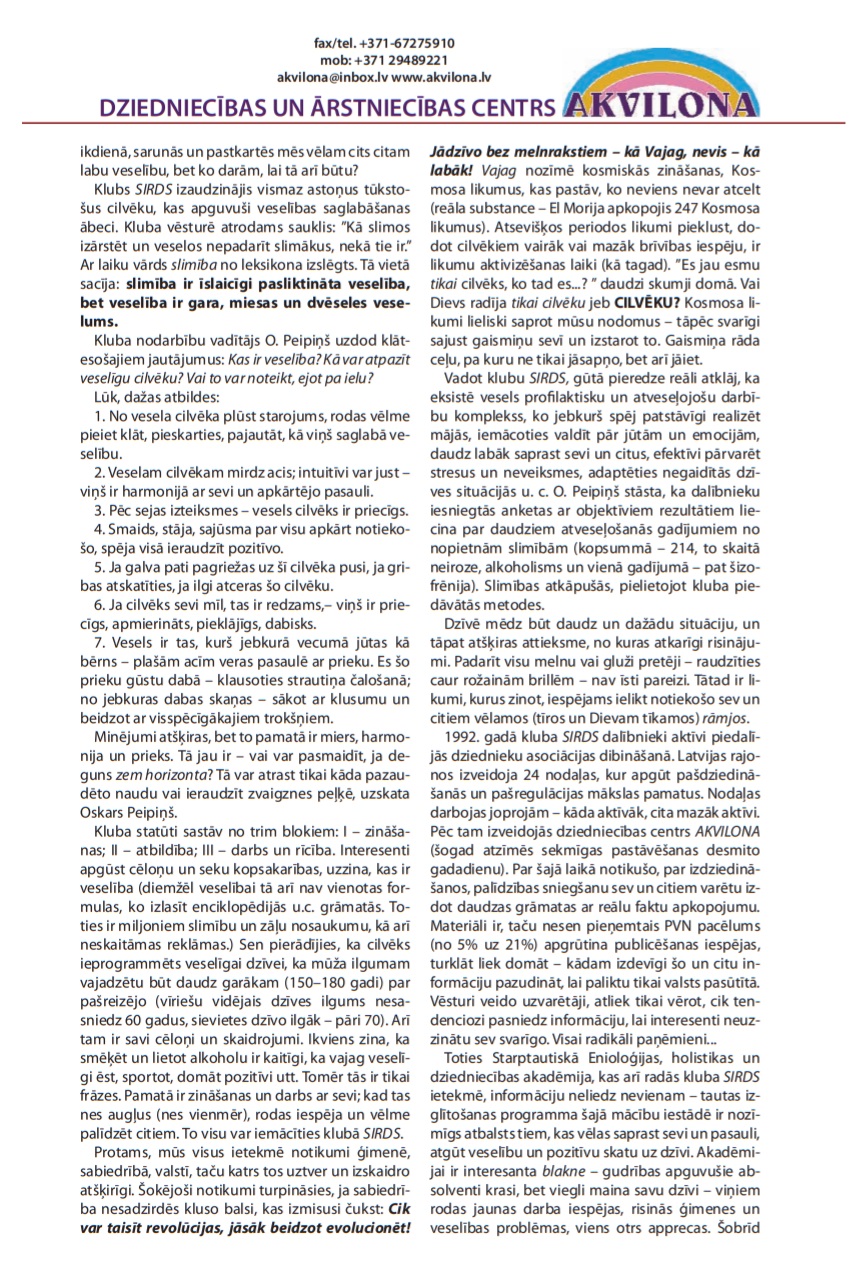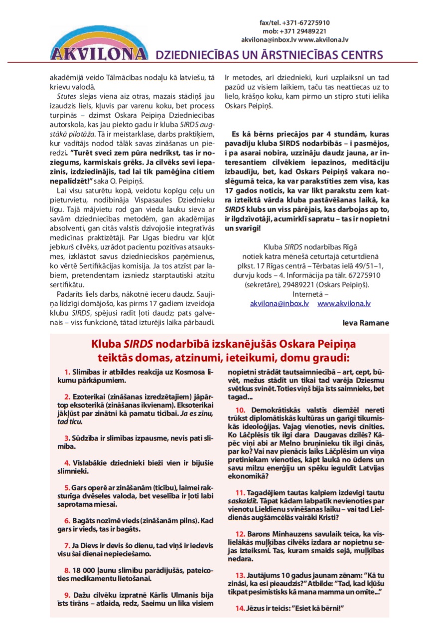 Pieredze, kura tika gūta, vadot Veselības klubu ,,SIRDS”, reāli parāda, ka mūsdienās eksistē vesels komplekss profilaktisku un atveseļojošu darbību, kuras pilnīgi jebkurš cilvēks spēj patstāvīgi izpildīt savās mājās, ar to būtiski palīdzot dziedniekam viņa tālākā darbā ar katru konkrētu pacientu. Radošajā sadarbībā ar dziednieku, pacients šādā veidā apgūst visas nepieciešamās prasmes, lai pats, jau rīkojoties dziednieciskajā tradīcijā, mācētu sniegt sev vajadzīgo palīdzību. Lūk – atlikuši ir daži soļi un cilvēks kļūst par dziednieku. Vispirms – par dziednieku pašam SEV. Protams, atteikties no kaitīgiem ieradumiem un no neveselīgu produktu lietošanas vēl ir par maz. Tieši tāpēc arī ir jāturpina mācīties. Ar to no 1992. gada arī nodarbojāmies Kluba “SIRDS” (“Pašdziedināšanas mākslas” kursu) ietvaros. Tagadējā laika posmā biežāk nākas šo darbu veikt individuāli ar katru interesentu.